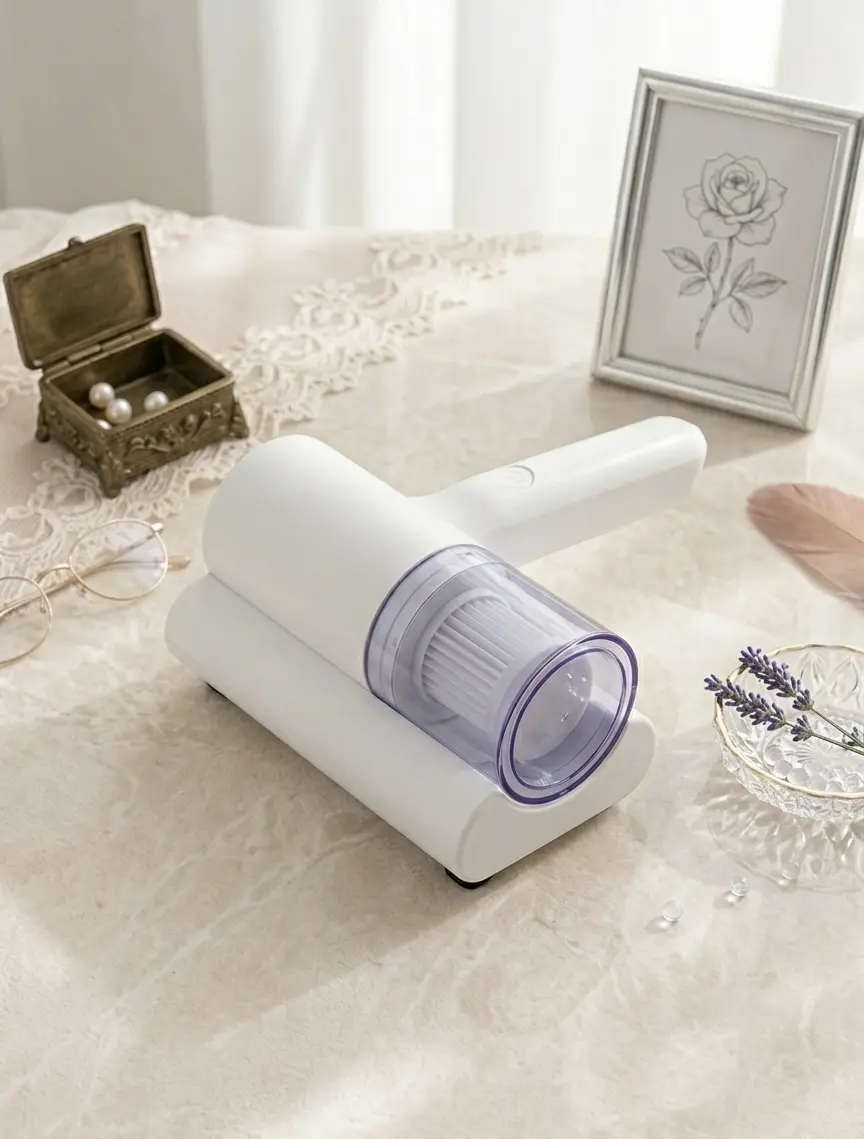 La aspiradora antiácaros 2024 limpia en profundidad con succión de 12 kPa, luz UV-C que elimina el 99,9% de bacterias y filtro HEPA que captura partículas de hasta 0,3 micras — todo lo que causa alergias, irritaciones y mal sueño.