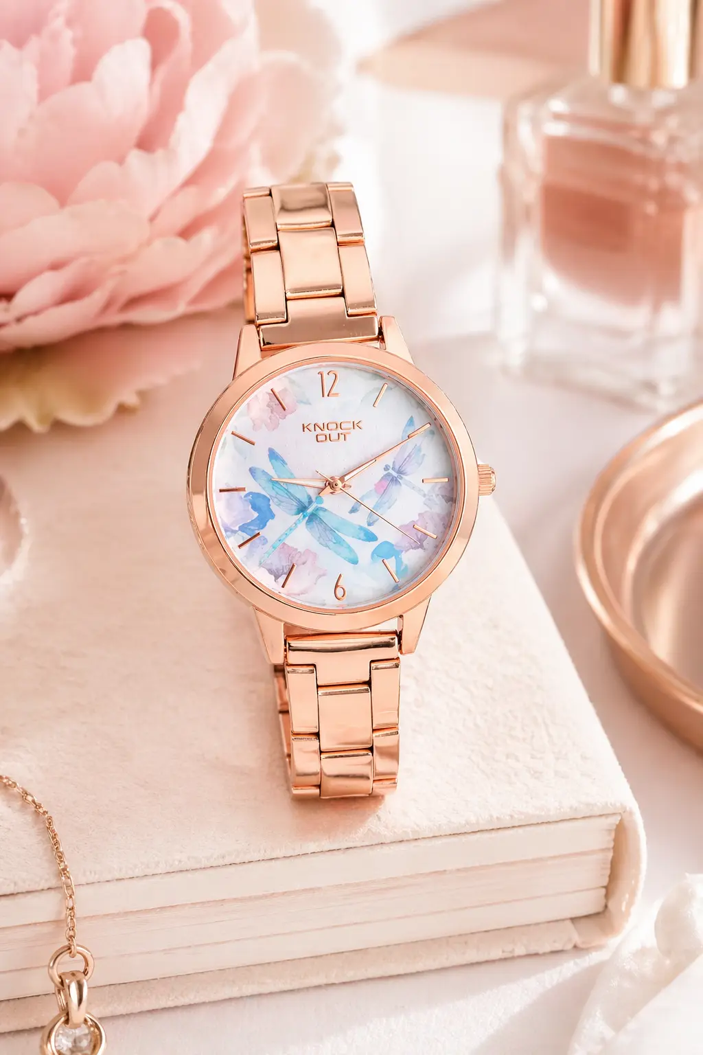 El reloj Knock Out combina una pulsera metálica de tono cálido con una esfera con ilustraciones en pastel que no vas a ver en la muñeca de cualquiera.